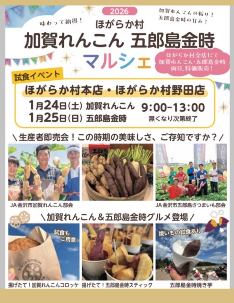 オンラインショップ レシピ 五郎島金時は、JA金沢市農産物直売所ほがらか村でも販売しております。ご注文は、下記3店舗で承っております。 ほがらか村 本店 076-237-0641 ほがらか村 野田店 076-245-4602 ほがらか村 崎浦店 076-262-6590 Brand伝統と革新をつなぐ五郎島金時ブランド ブランドサイトへ Information五郎島金時に関する最新ニュース イベント情報 五郎島金時マルシェ開催!! 2026.01.23 その他 五郎島金時の公式サイトをリニューアル致しました! 2025.12.26 一覧を見る Activity地域とともに育む活動 SDGs ふるさとの産物に愛着を持ってもらう目的で、小学校などへ食育教育として講演に伺っています。 ワクチン JA金沢市五郎島さつまいも部会は、売り上げの一部を認定NPO法人「世界の子どもにワクチンを日本委員会(JCV)」へ寄付する活動を行っております。 Map五郎島地区マップ 港大橋を渡ったヶ所一帯が主な五郎島金時の産地です
